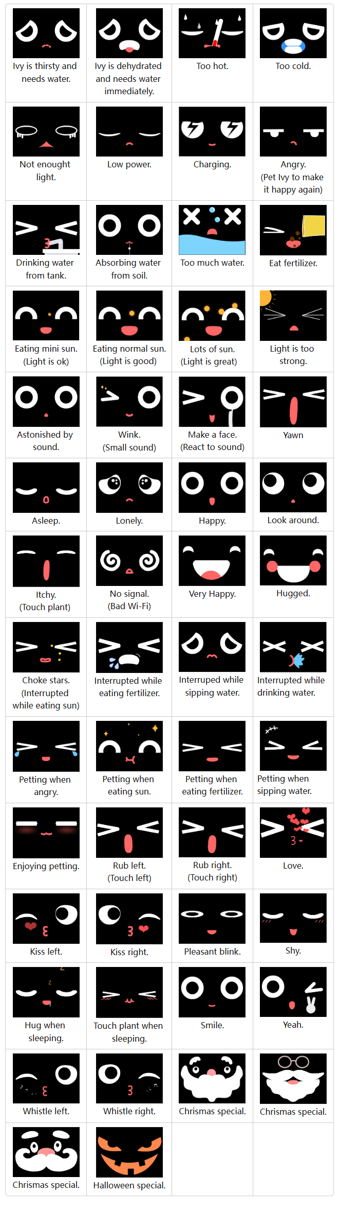 The list below outlines most of Ivy's expressions and their corresponding meanings. Ivy’s behavior is powered by behavior model technology, and with OTA upgrades and system file hot updates, Ivy will gain more expressions and behavioral interactions over time. We will keep this list as up-to-date as possible.