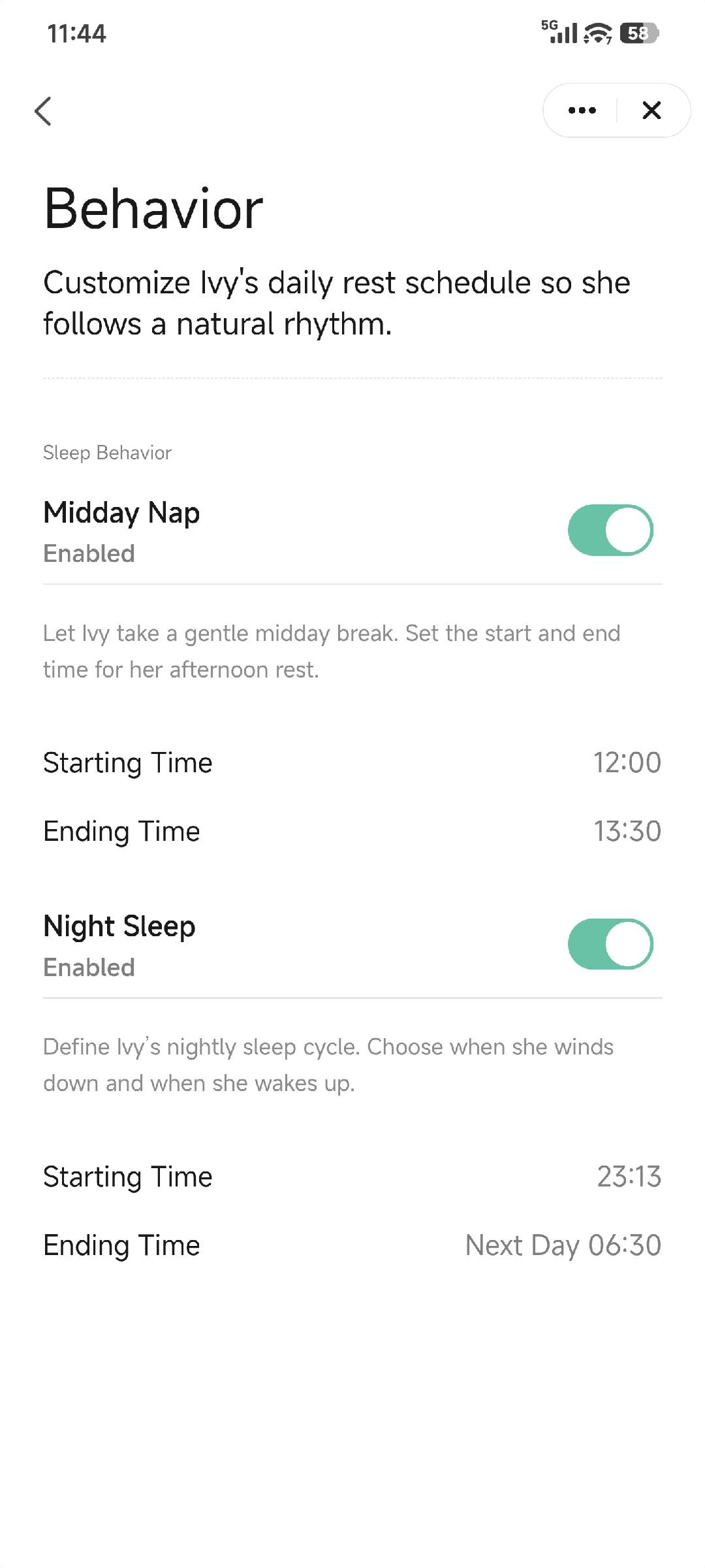 Set your preferred Midday Nap period and Night Sleep period.